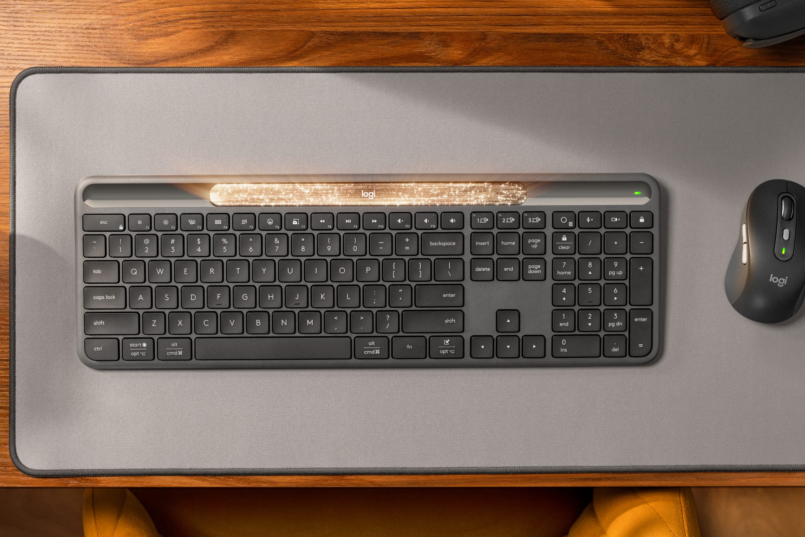 Beyond its solar charging capabilities, the K980 has a pretty standard full-size layout, with Windows and macOS key labels, directional keys, and a numpad. Its function row is pre-programmed to control media, screen brightness, and volume, although you can customize their secondary features (or turn off secondary features altogether) in the Logi Options Plus app for Mac or Windows. The K980 also includes a mic mute key, a camera on/off toggle, and an Action key along the top row that can be programmed however you’d prefer in the app. It also features a new addition: an AI Launch key.