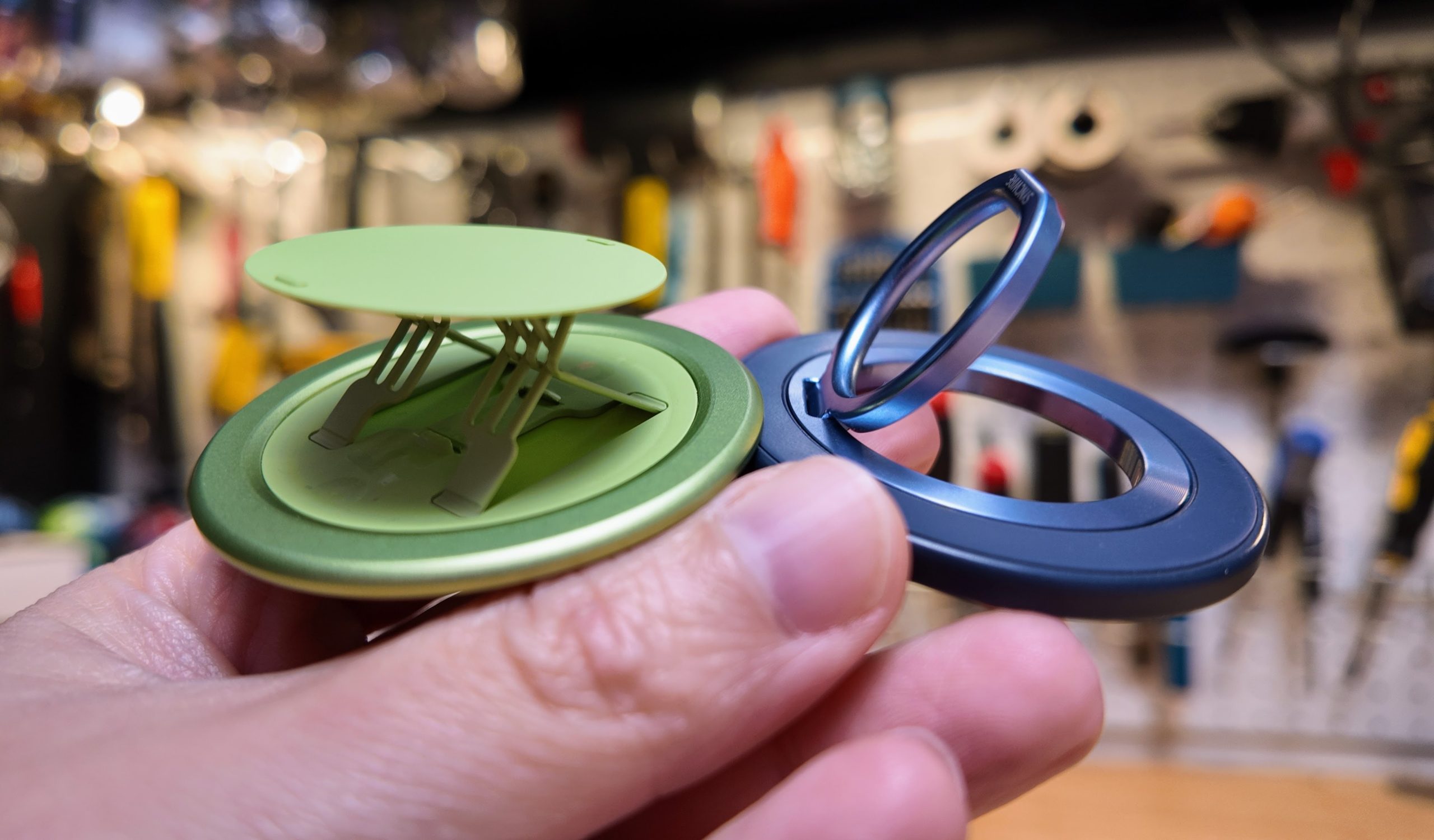 The OhSnap Snap Grip 5 next to a Syncwire magnetic ring. | Photo by Sean Hollister / The Verge